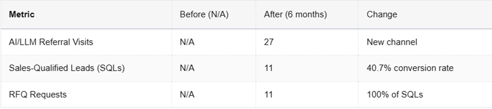 Before this initiative, there was no tracked visibility or funnel impact from AI referrals. We estimated a 5% traffic-to-lead conversion rate would be a strong result vs other channels for this client. What actually happened went far beyond our expectations.