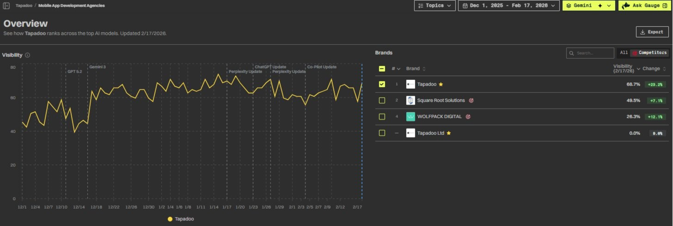 Gauge visibility dashboard — Tapadoo ranked #1 at 47.7% across all AI platforms in the Mobile App Development Agencies category (Dec 1, 2025 – Feb 17, 2026).