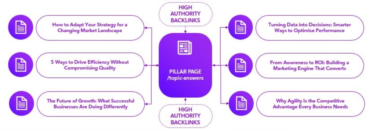 Topic cluster methodology — pillar pages act as the central authority hub, supported by targeted content pieces and high-authority backlinks that compound topical authority over time.