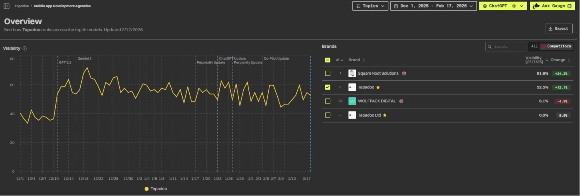 On ChatGPT specifically, Tapadoo grew from approximately 40% to 52.5% — a +12.1 point increase.