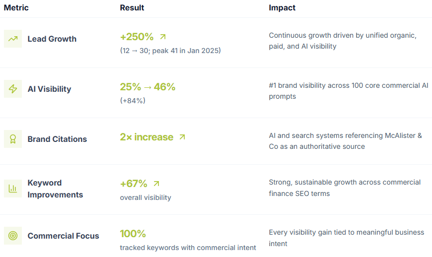 This integrated approach ensured McAlister & Co appeared consistently across every stage of the modern search journey — from paid visibility to organic authority to AI-driven recommendations.