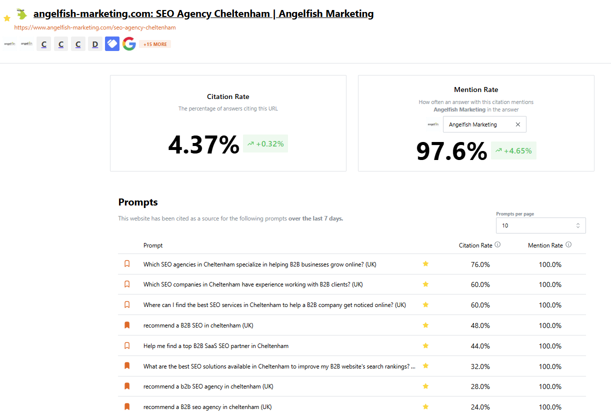 We can see here for our own website that our SEO Cheltenham content is directly helping LLMs to cite our page and mention our brand in relevant prompts. Without this core pillar page, we would have a lower chance of being cited or mentioned.